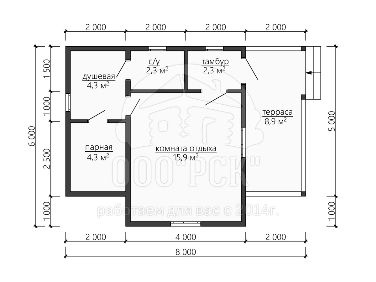 В состав этой бани входят не только основные помещения, но и небольшая открытая веранда площадью 9 м2. Здесь вы сможете проводить время на свежем воздухе, наслаждаясь красотой природы и комфортом вашего дома. Также в бане предусмотрен тамбур при входе, который отлично подойдет для предварительного раздевания и готовки.